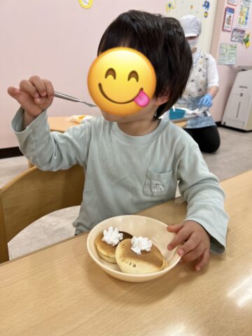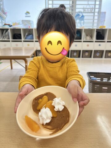 自分でホイップクリームやみかんをホットケーキにトッピングしましたよ😋