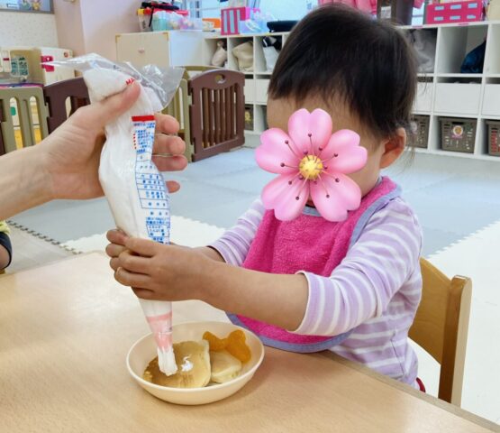 みんな大好きなみかんをスプーンでのせ、クリームをたっぷりつけました🥄我慢できずに食べちゃう子も☺️